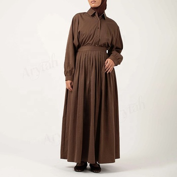 カスタム女性用ムスリム2ピースセットプレミアムファブリック女性用ボタンシャツとプリーツスカートセットイスラム控えめなフルレングスセット
